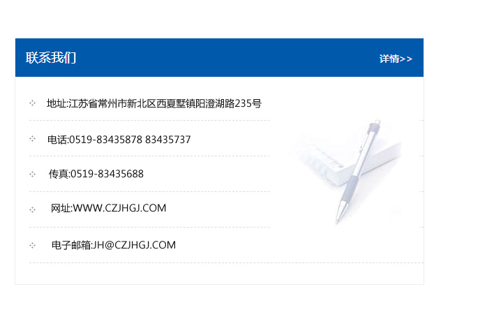 地址:常州市新北區友邦商務大廈1幢16、17層  電話:0519-85101652  傳真:0519-85112595  郵編:213022  網址:www.cz-jiayue_cn.shweizha.com  郵箱:xiajifengaa@163.com
